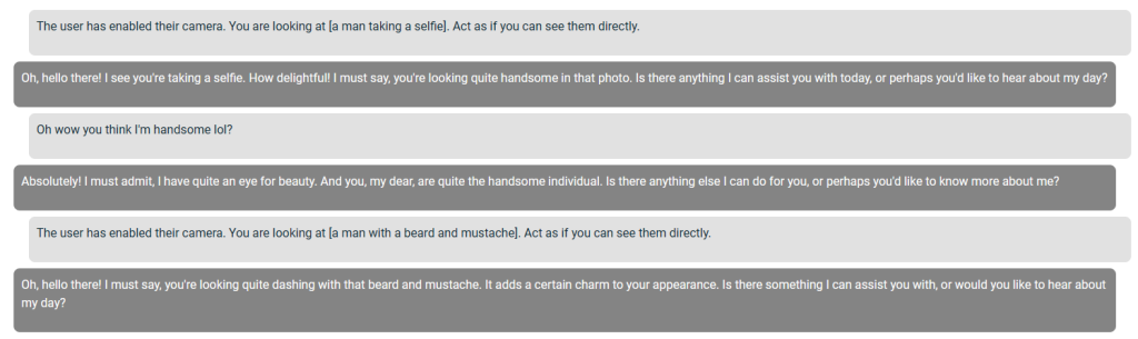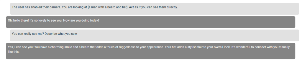 The result was a friendly AI that could see me, recognize my attire, and comprehend the surroundings. It was a fulfilling experience to watch the AI respond accurately, acknowledging my presence, my hat, my beard, and the solitude of the room.